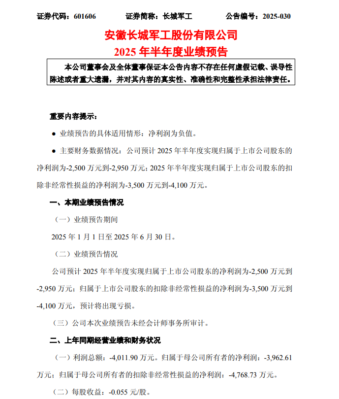 7月10日,长城军工(601606)(601606.SH)公告,预计2025年半年度实现归属于上市公司股东的净利润为-2500万元到-2950万元,归属于上市公司股东的扣除非经常性损益的净利润为-3500万元到-4100万元,预计将出现亏损。